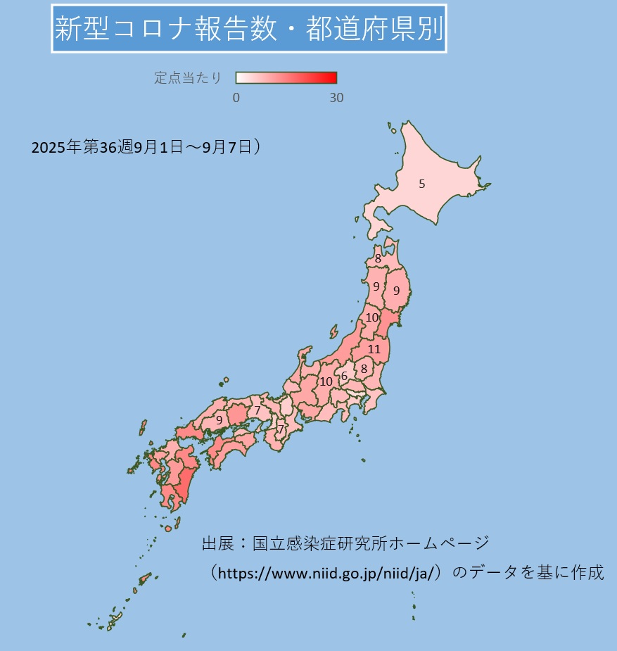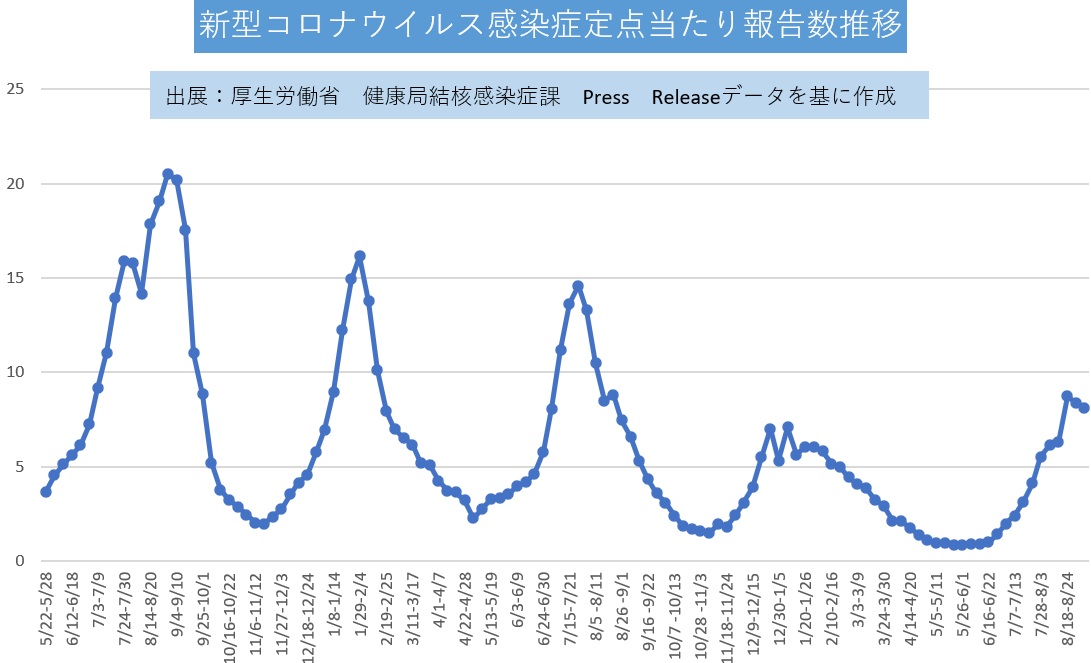 2025年9月1日~9月7日 2025.09.12 新型コロナウイルス感染症定点当たり報告数の第36週目(2025年9月1日~2025年9月7日)です。2023年5月からの報告数推移をグラフにしました。 < 2025年9月8日~9月14日2025年8月25日~8月31日 > NEW 2025.07.29 2025年夏季期間中もカレンダー通りにキエルキンを製造・出荷します! 2024.12.19 年末年始の出荷について 2024.11.16 【キエルキンをまだ使ったことがない方へ】お得なご新規セットを試しませんか?【2024年11月20日~2025年5月16日まで】 2024.07.30 2024年夏季もカレンダー通りにキエルキンを出荷します! 2024.04.26 除菌のしすぎは良くないのでは?